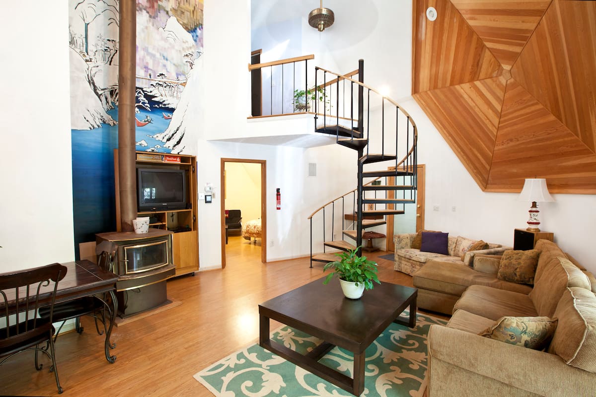 This dome house in West Virginia is a stylish, modern cabin in the woods! With 25-foot ceilings, a fireplace, and a spiral staircase, this unique stay will make you feel like youโre in a dream. The dome house is located 4-miles from the historic Harpers Ferry and is close to the Shenandoah River and less than a mile from the Appalachian Trail.